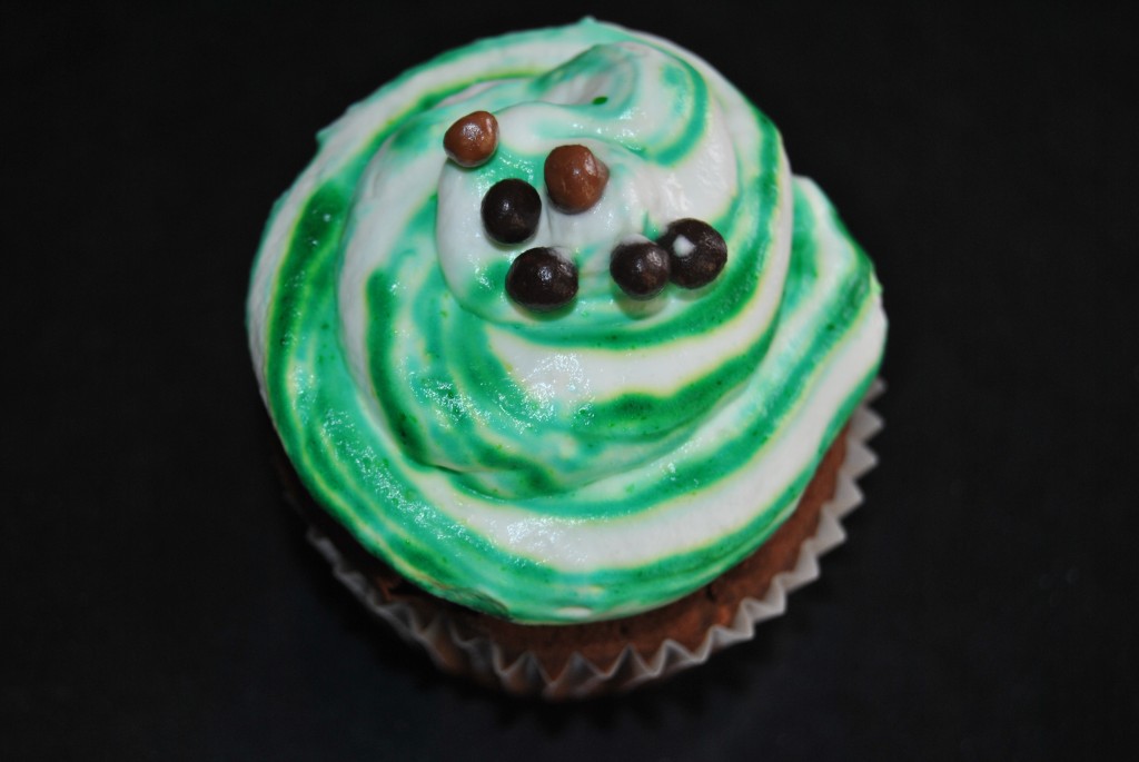 Pintar franjas verdes en una manga pastelera con 3 cm de separación cada una. Introducir la cobertura. Cubrir con el frosting y añadir unas perlas de chocolate.